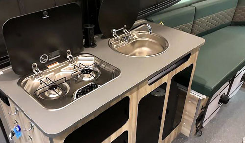 Galley with stainless steel cooktop and sink (both with tempered glass covers)