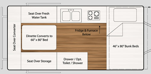 Exterior length (folded) Exterior width Travel height (folded) Exterior open height Interior open height Dry weight Hitch weight GVWR Cargo capacity Fresh water tank Grey water tank (option) LPG Sleeps Layout |