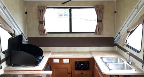 The interior furnishing is quite impressive as for this class of folding campers. The galley located at the front of the camper is equipped with 3-burner stove, 3 cubic feet refrigerator and double-bowl stainless-steel sink with faucet. The cabinetry offers plenty of storage and countertop space. And thanks to the front-dormer (standard in XL-1935), the whole kitchen area has genuine 80 inches headroom.