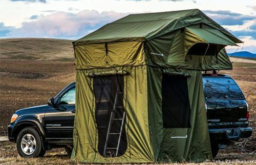 Note: CVT is an all-American manufacturer of canvas-based rooftop tents (currently 16 models). However, the company also makes one hard-shell model – Mt. St. Helens. With fiberglass floor and roof and typical rip-stop poly/cotton canvas it can sleep 2 to 3 persons.
