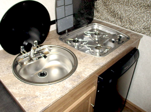 While interior is not clearly partitioned, it is still quite functional. For example the main section of the kitchen - cabinet with cook-top and sink is located in the right-front corner of the trailer (street-side). However the cabinet providing the workspace and housing the microwave oven is located along the curbside-wall on the left from the entrance door. To be correct, both appliances: sink and 3-burner cook-top have flush-mounted glass covers, so this part of the galley can be quickly converted into a working space. But it is not always a practical solution. On the positive side – the interior is not that spacious, so certainly you would not be making “miles” when cooking. After all, such kitchen arrangement can be actually seen as the “kitchen with an island” (or rather with “peninsula” given the fact that the second kitchen cabinet is attached to the wall).