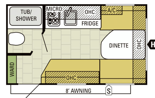 The private, walled wet-bath is now an appreciated standard in small travel trailers. The 14RB offers a foot-flushed toilet, curtain separated shower with tub and ceiling vent as well as mirror. The 6 gallons DSI water-heater w/bypass completes the long list of “necessities” making vacations a memorable experience.