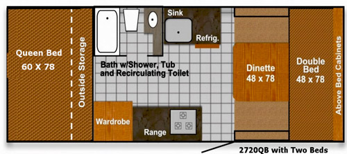 The series includes also models 2720QS (Queen-bed & Slide-out Living Room as well as 2720QD (Queen-bed & Slide-out Dinette). The popularity of the 2720 series comes from attractive layout with generous space and “manageable storage length” that with the help of “Swing-hitch” comes down to only 18 feet. This makes it possible to store the camper in most home garages!